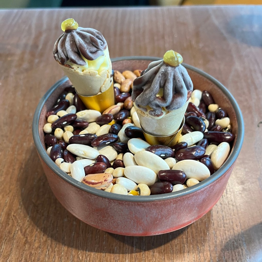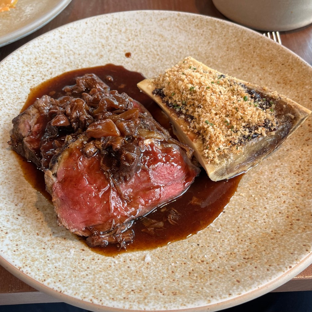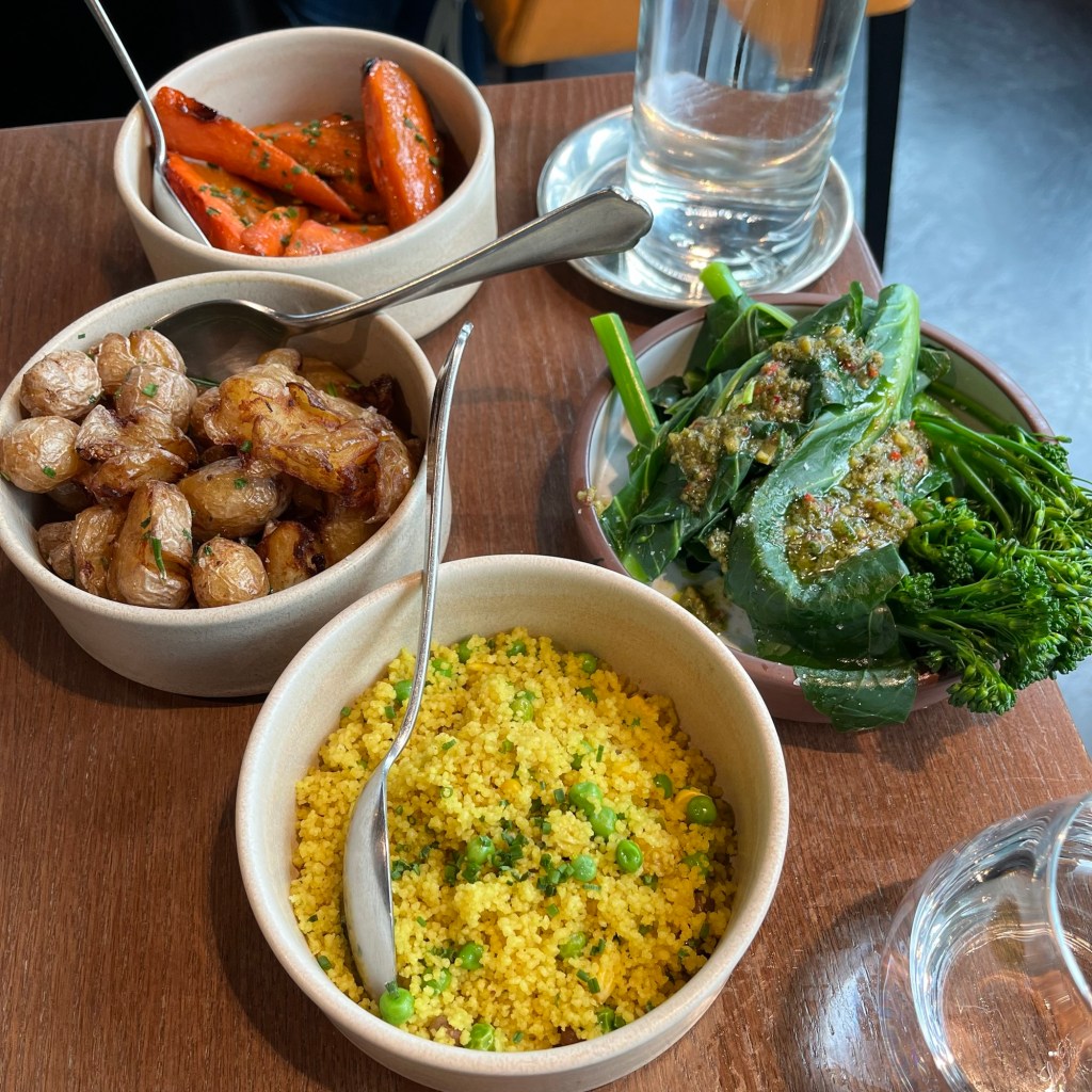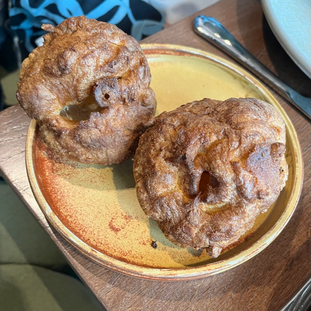 Next to come was the MAIN COURSE and oh my please make sure you’re hungry. We chose the Free-range chicken supreme, brown stew, jerk chicken, fried wings, coleslaw and the Beef & marrow, 45-day aged strip loin, oxtail gravy, herb crusted bone marrow, shallot marmalade. These were accompanied by Ginger glazed carrots, roasted new potatoes , Gungo peas & couscous, spring greens and Yorkshire puddings. Both roasts were absolutely delicious but now we needed a little rest before dessert.