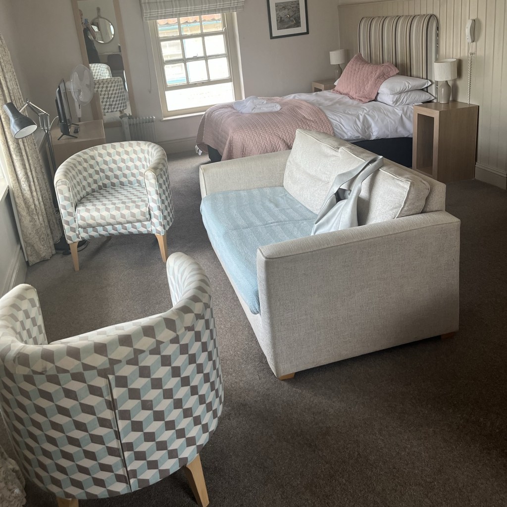 ACCOMMODATION – I have to say and to be honest so did the owner that we were in the best room. It was room No.1 called the Bowline Room where we had a double bed , three piece suit , dressing table , separate bathroom and plenty of storage space. But to top it all off it had a fantastic view of the quayside.
